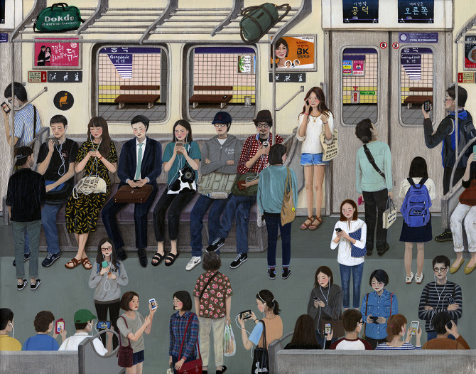 Pinturas coloridas donde la perspectiva y las proporciones se vuelven locas, pero que encierran la esencia de la vida en Corea (como ya vimos, con otra perspectiva, en las ilustraciones de Puuung) y en el resto del mundo.